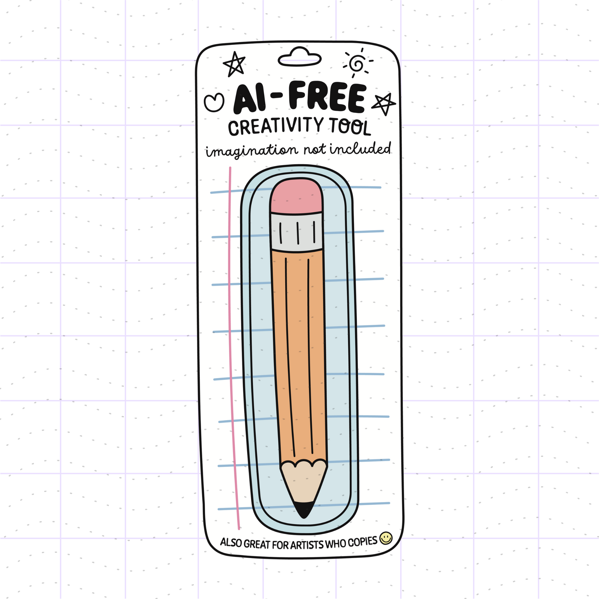 - A funny blister pack with a pencil. The packaging says "AI Free Creativity Tool; imagination not included; perfect for artists who copies".