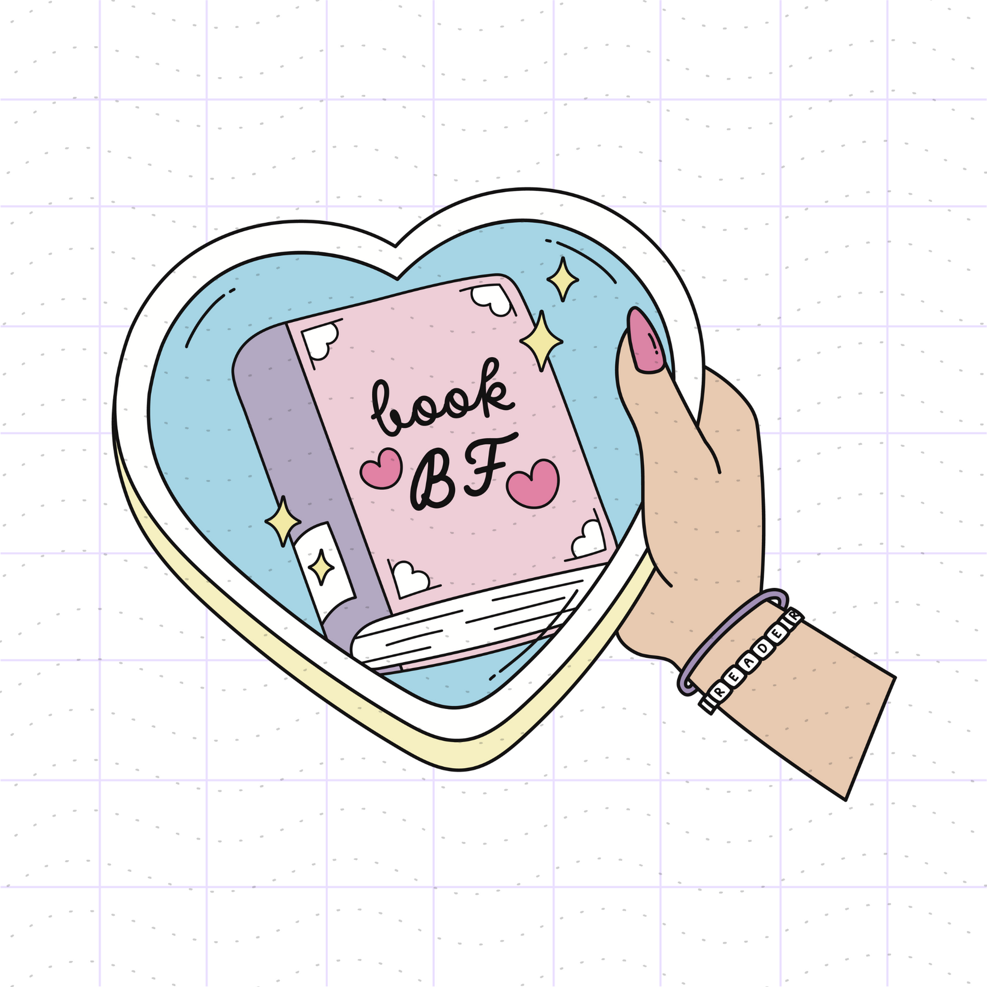 - A cute and funny heart framed photo of a book that has the title "Book BF". The frame is held by a hand with a purple bangle and a pony beaded letter bracelet that spells out "reader".