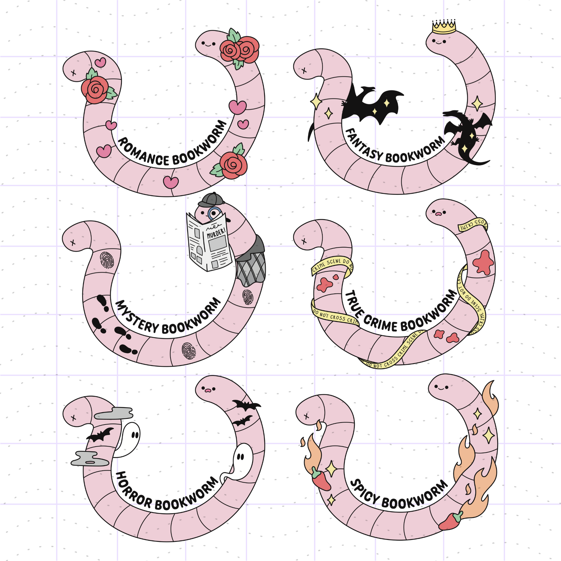 This cute and funny hand drawn Book Genre Bookworm Bundle clip art includes 6 PNG file(s).