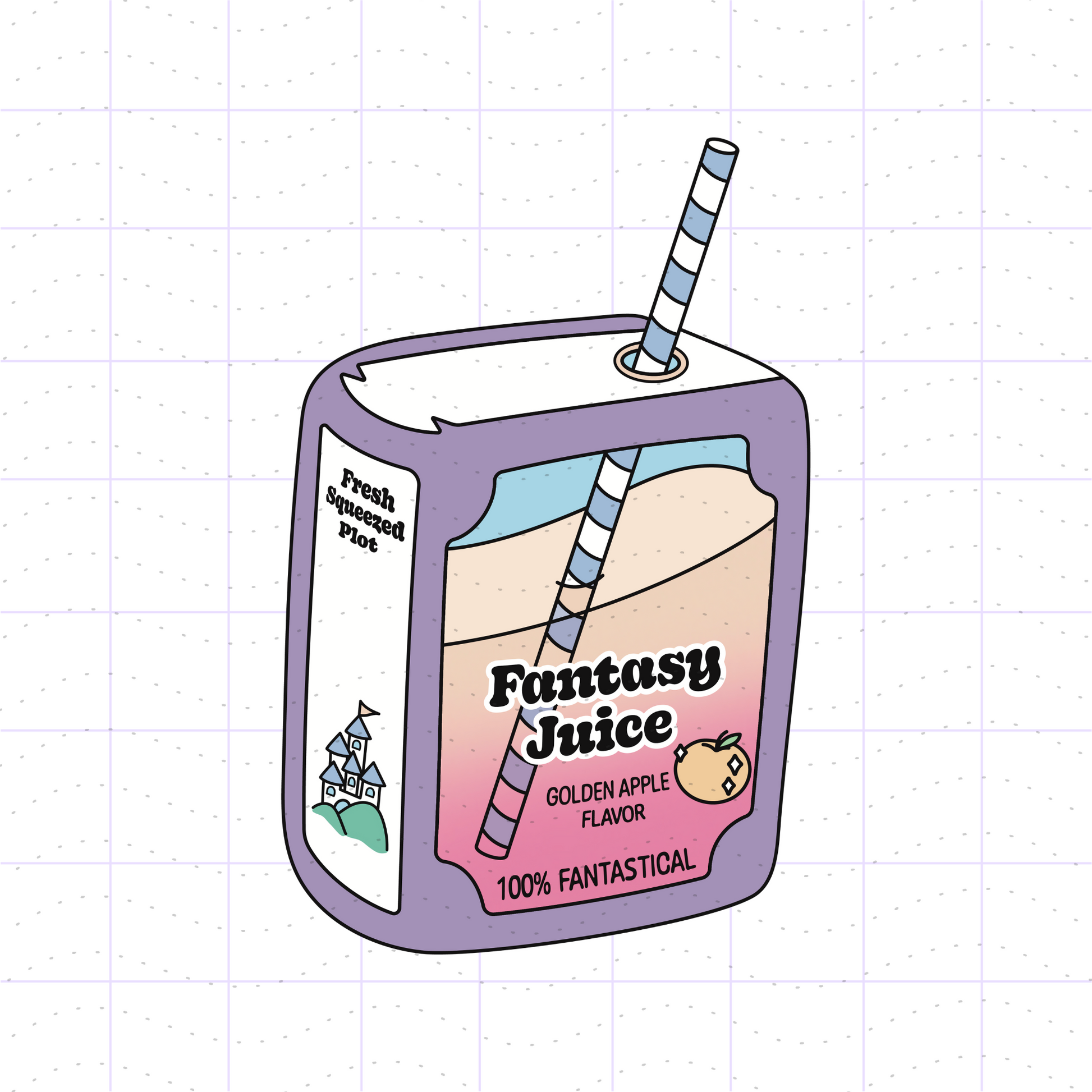 - A cute purple golden apple flavored fantasy book juice box with a castle.