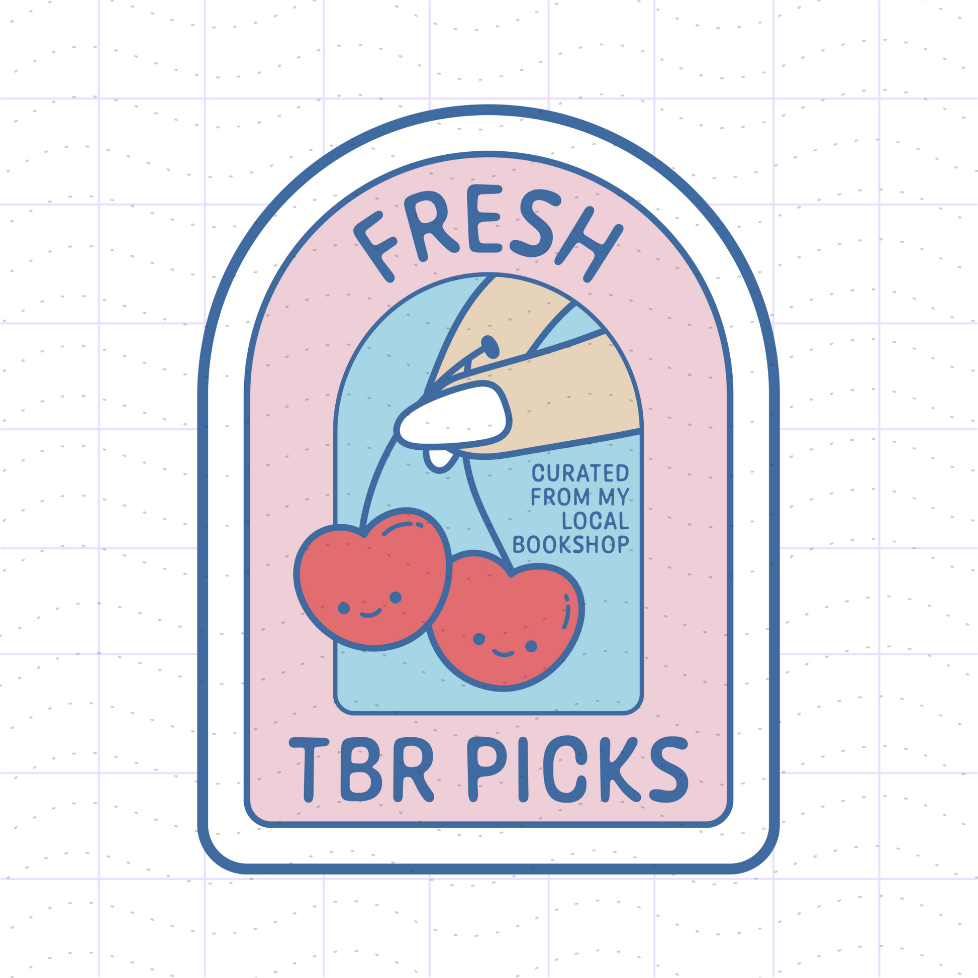 - a "Fresh TBR Picks - Curated from my local bookshop" ellipse sticker with a feminine hand picking smiling cherries.