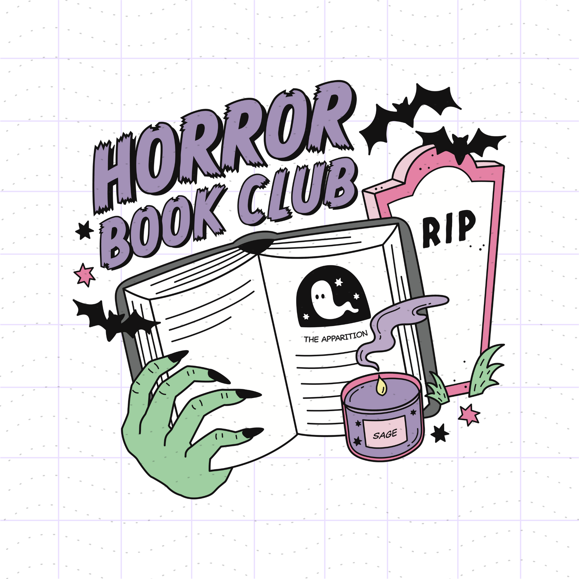 - A "horror book club" comic style design with a book, tombstone, sage candle, green hands, bats.
