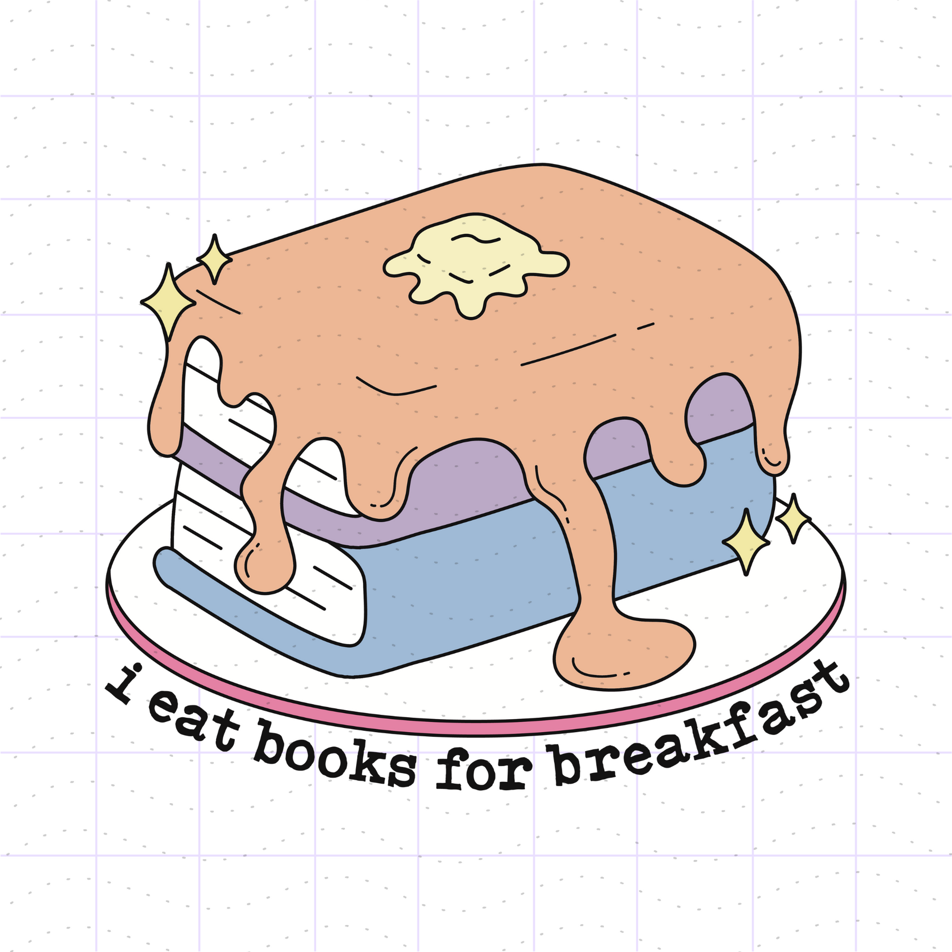 - A cute and funny stack of books on a plate with syrup and butter, mimicking a stack of pancakes, with the message "I east books for breakfast" written below.