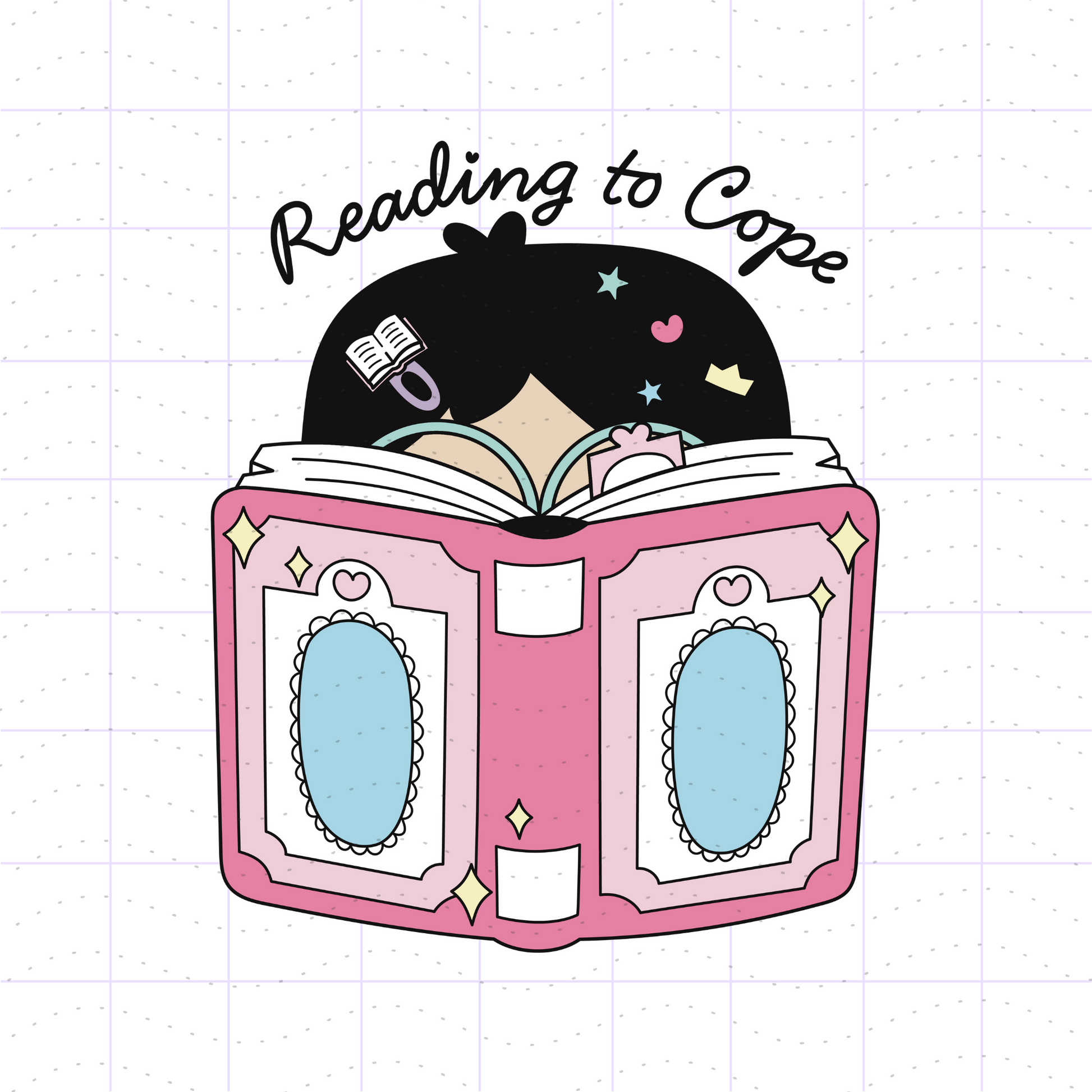 - A girl/boy with kawaii hair accessories reading a pink book with the quote "Reading to Cope". **Includes 3 skin tone colors. You may also change the colors by editing the SVG files.