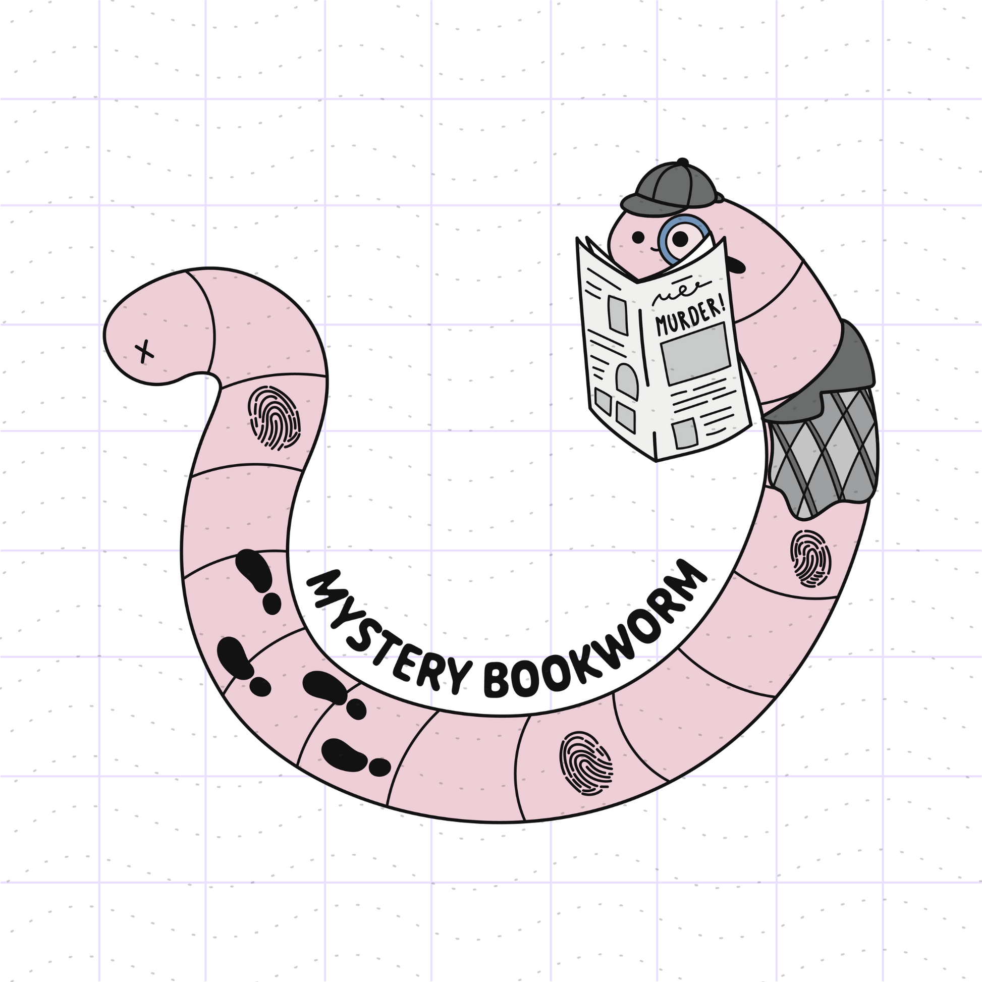- A cute worm with a hat, inverness cape, newspaper, magnifying glass, footprints, finger prints, and the words "Mystery Bookworm".