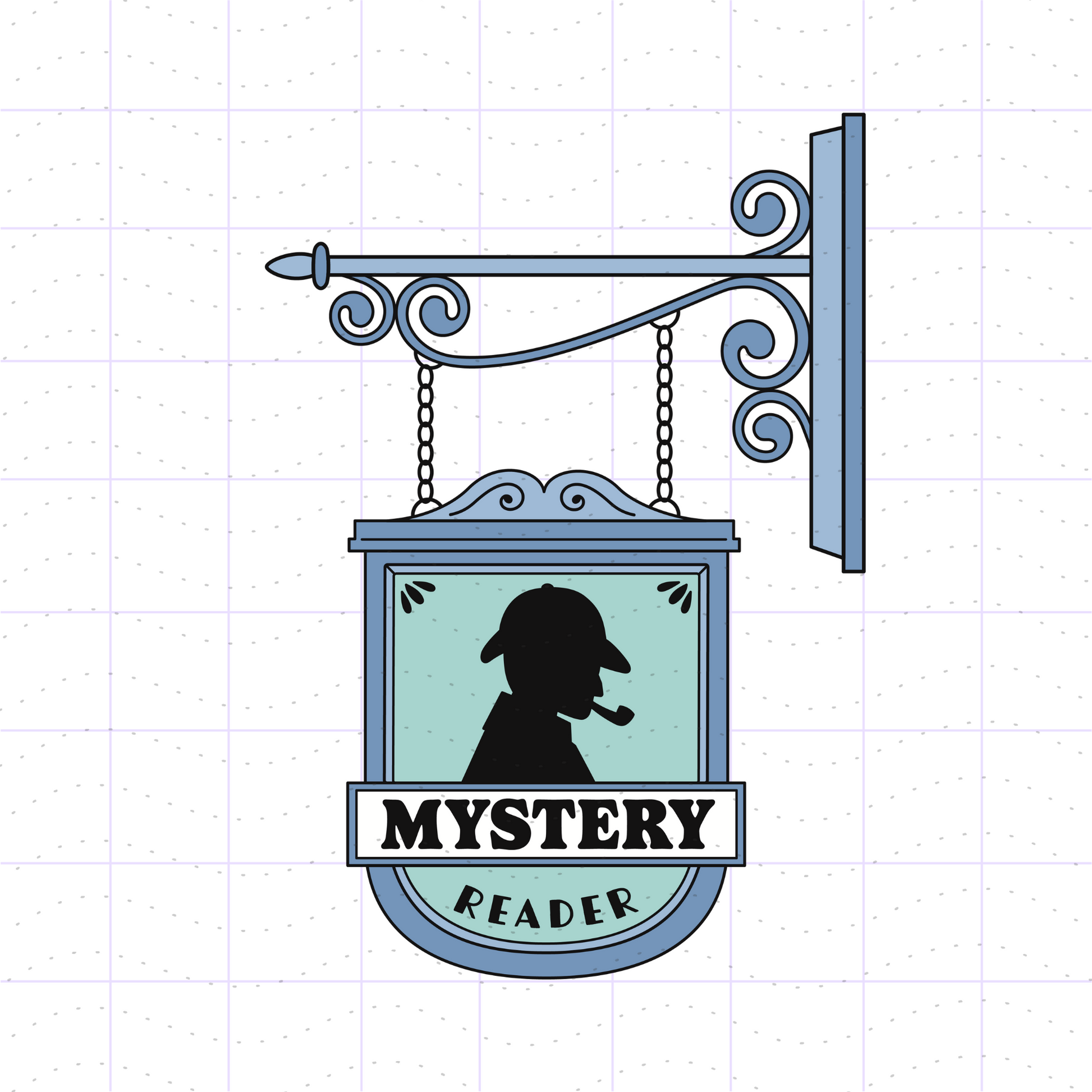 - A mystery bookshop sign that says "mystery reader" with a detective Sherlock Holmes inspired silhouette.
