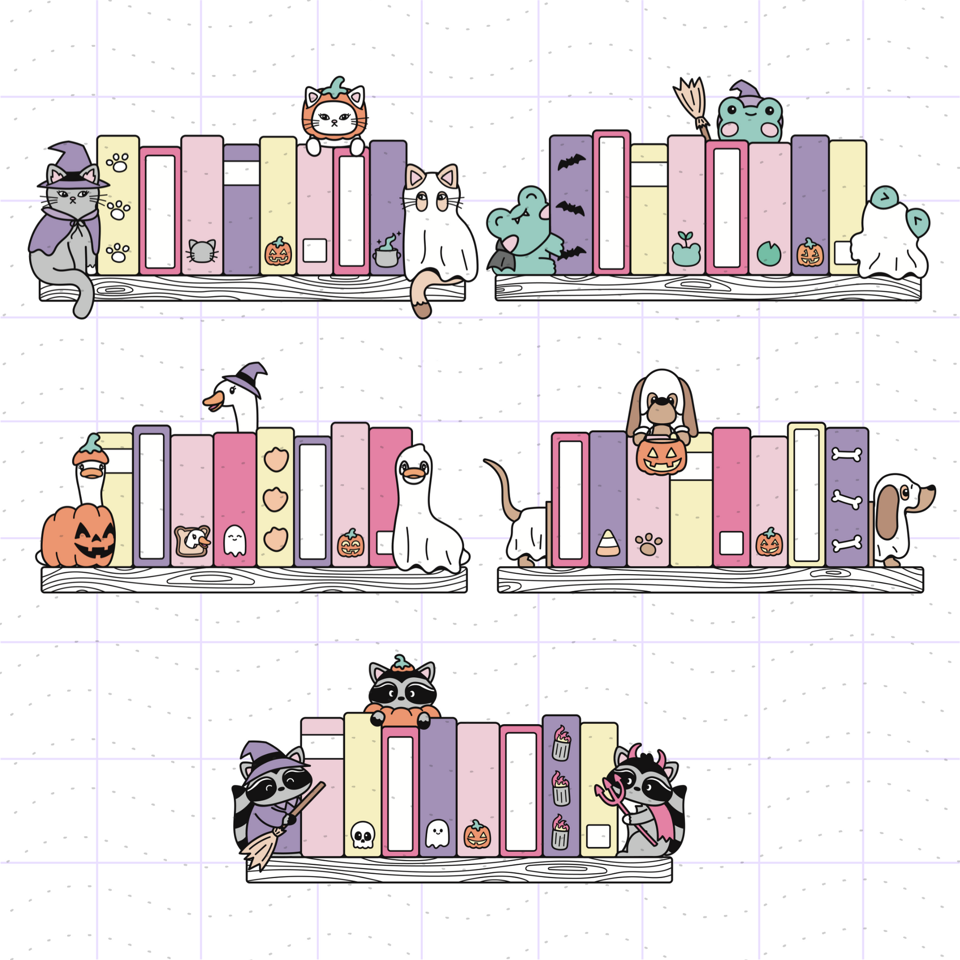 - 5 pink Halloween animal bookend bookshelves in the following themes: Goose, Cats, Dachshund Dogs, Raccoons, and Frogs.