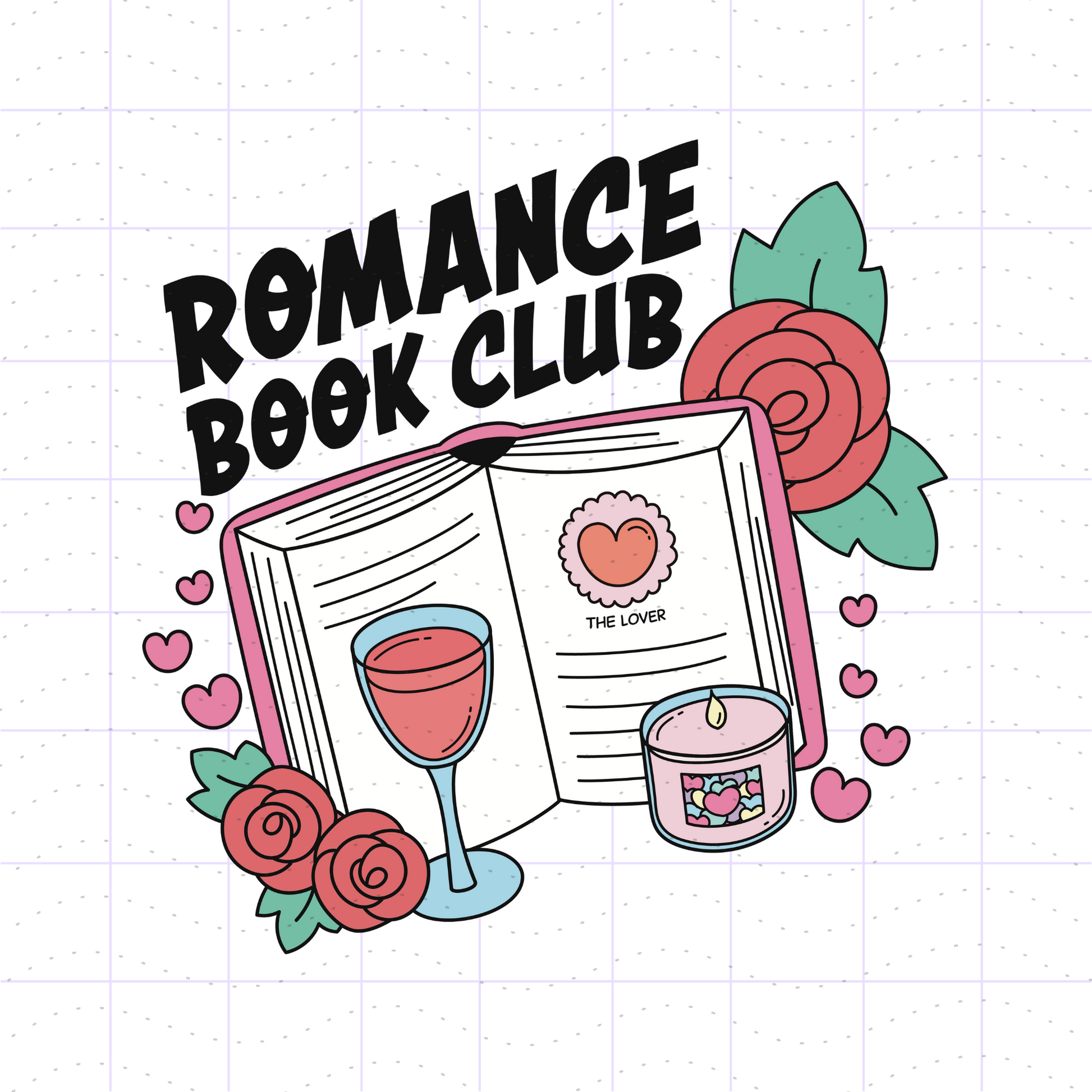- A "romance book club" comic book style design with a book, roses, glass of wine, candle, and hearts.