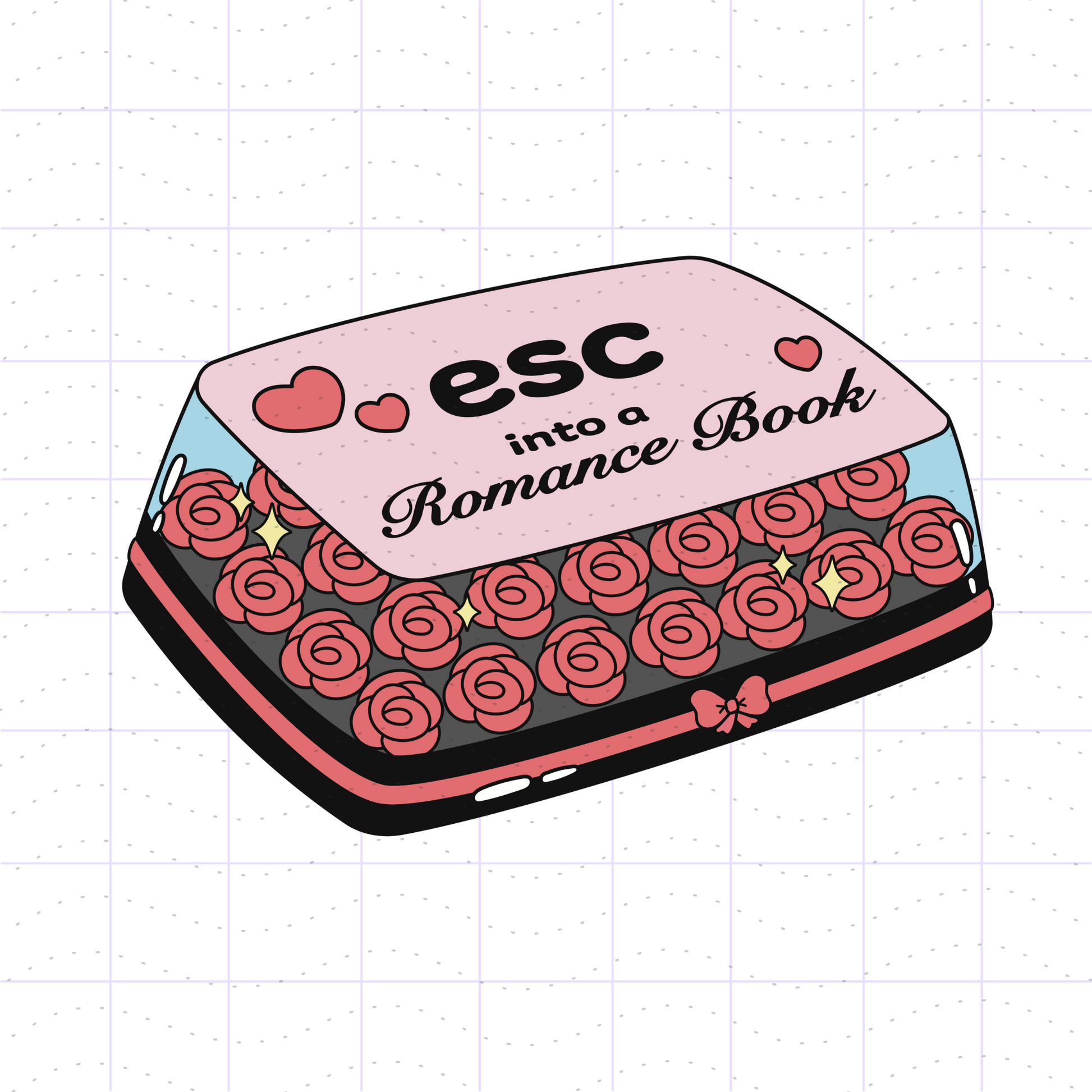 - a cute see through keycap that says "esc into a romance book" with a bundle of infinity roses.