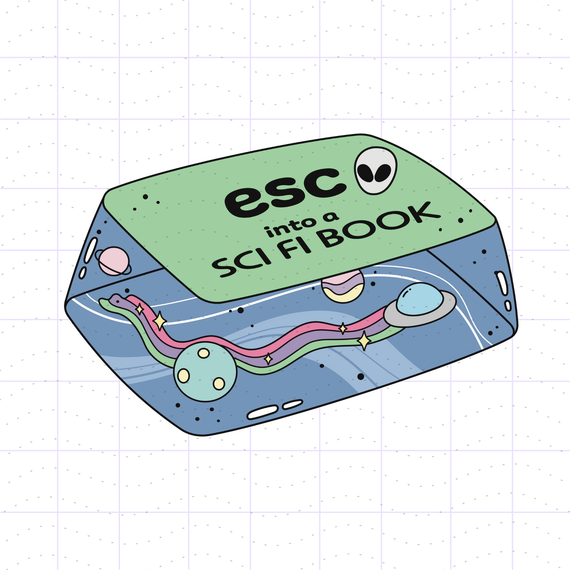 - a cute see through keycap that says "esc into a sci fi book" with an alien, UFO, and planets in outer space.