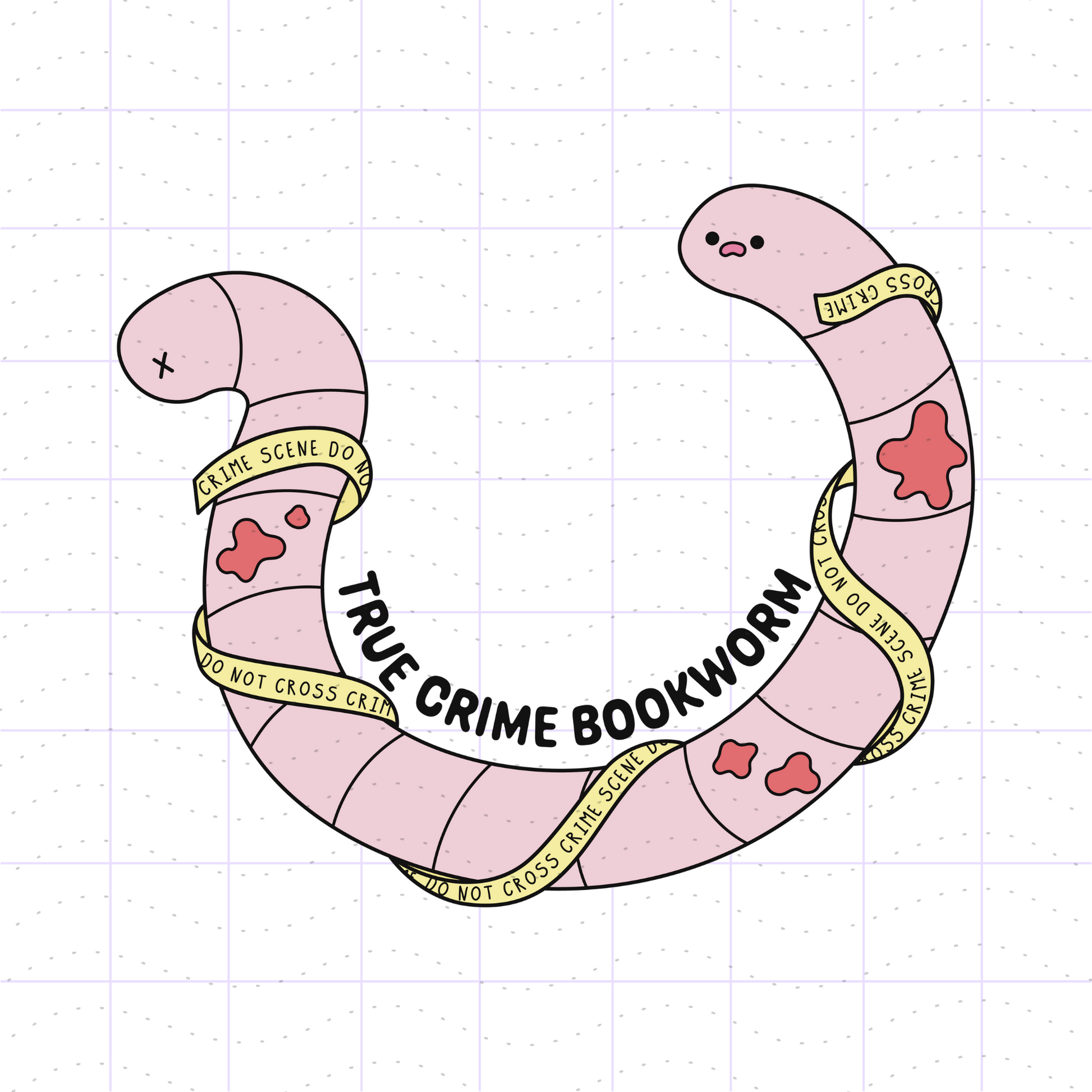 - A cute worm with a crime scene tape wrapped around its body, blood splatter, and the words "True Crime Bookworm".