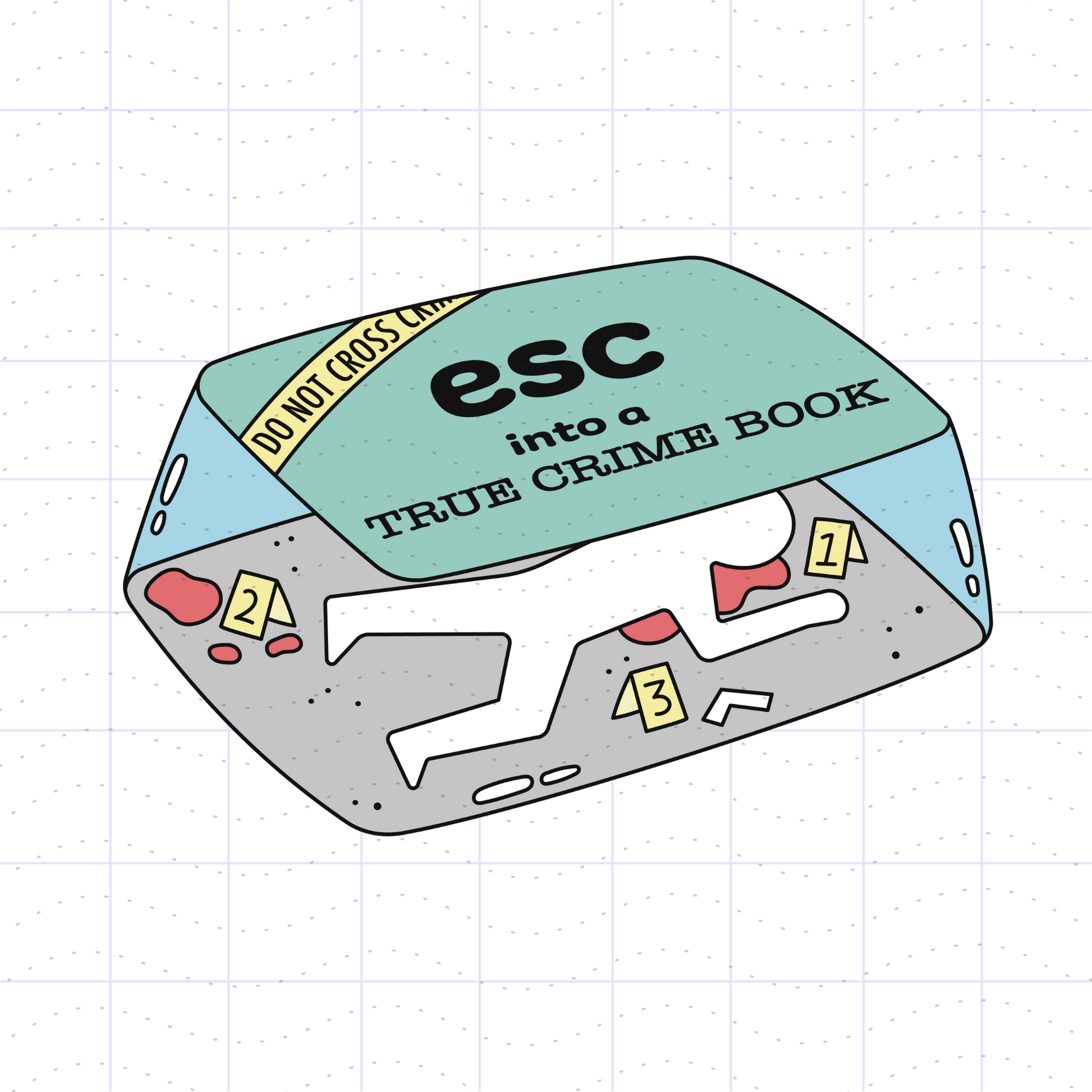 - a cute see through keycap that says "esc into a true crime book" with a crime scene body and gun chalk outline, blood, and evidence markers.